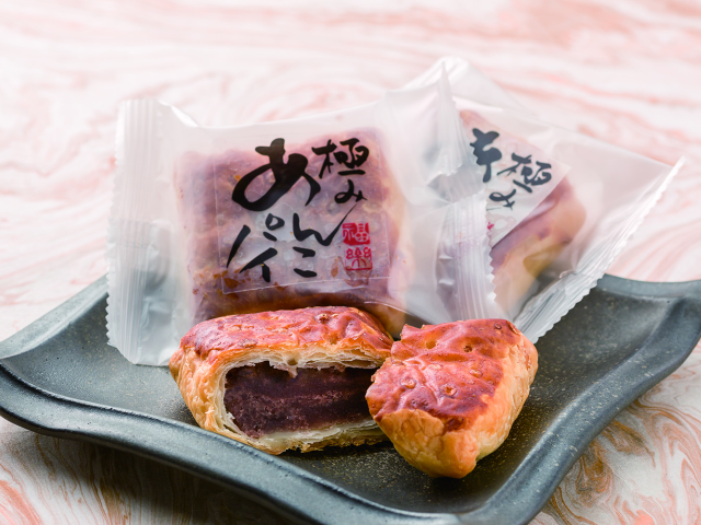 店頭販売のみ香ばしいバターの香り豊かなパイ生地に、福楽特製の滑らかなこしあんを包み込み焼き上げた一品です。
