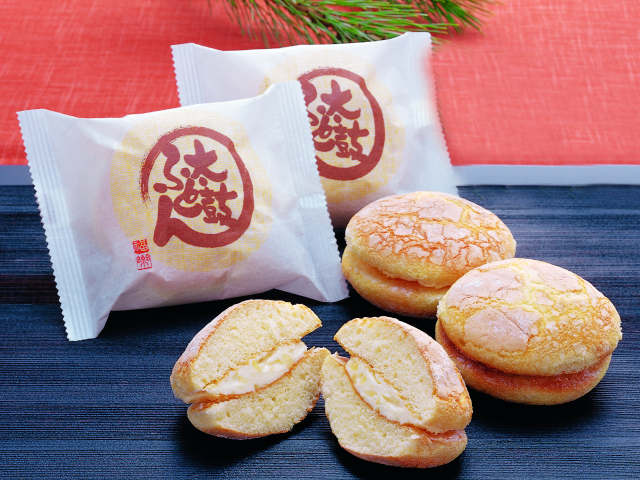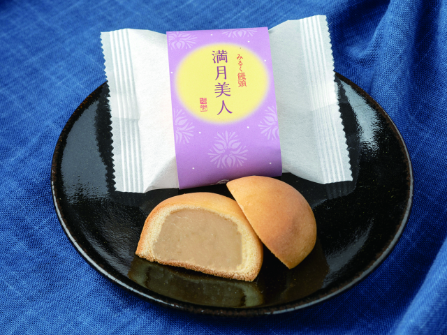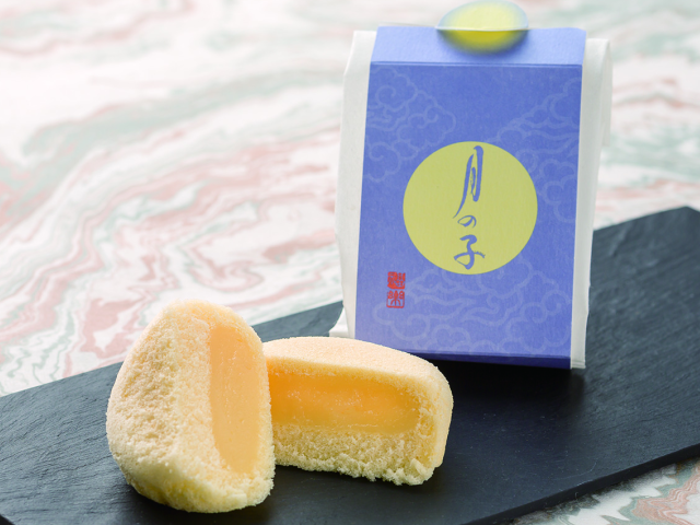店頭販売/通販蒸しカステラと滑らかなカスタードクリームがほどよく調和した洋風の創作銘菓です。月のような姿が特徴です。