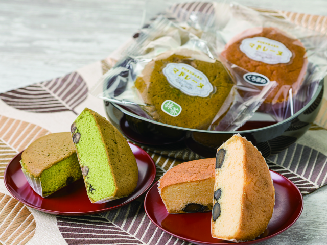 店頭販売のみ国産バターをふんだんに使用したマドレーヌに丹波産の黒豆を、抹茶味には丹波大納言を入れて焼き上げました。
