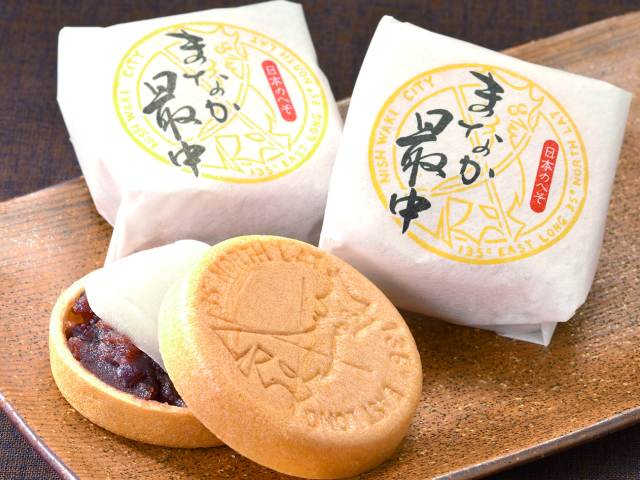 店頭販売/通販西脇市のシンボル「日本のへそ」をデザインした最中種(もなかの皮)は石川県産の特注品です。北海道産の極上大納言に求肥を挟んだ逸品です。