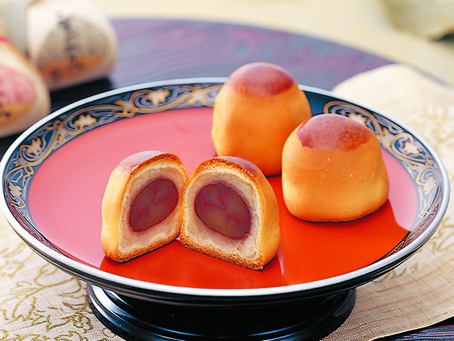 店頭販売/通販大粒の渋皮栗をまるごと包み、まんじゅう生地で風味豊かに焼き上ました。厳選した素材から生まれた本物の味わいをご賞味ください。