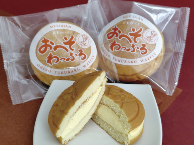 店頭販売のみ北海道産の上質小麦を使用したふわふわ生地に、なめらかな食感のカスタードクリームを取り合わせた人気のワッフルです。西脇市のロゴ入りです。