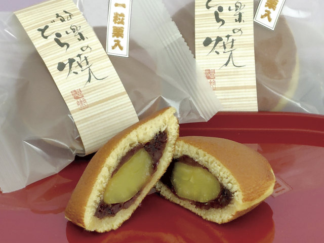 店頭販売/通販大きな一粒栗を使った福楽特製のどら焼きです。一粒栗と北海道産大納言を使用した餡との相性は抜群で、ひと味異なるどら焼きをご堪能ください。